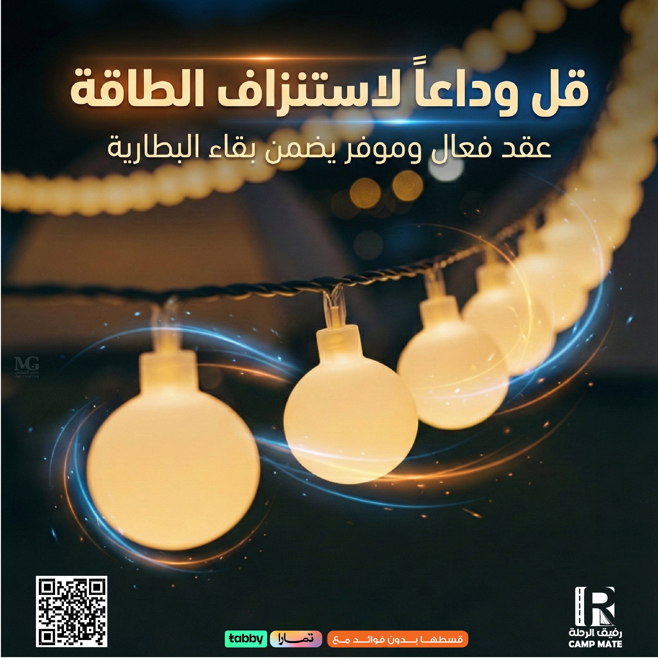 عقد الإنارة الشمسي بطول 12 متر من "رفيق الرحلة" هو حل مصمم خصيصاً لتلك الليالي. إنه يتجاوز فكرة مجرد مصباح واحد إلى نظام إضاءة متكامل يوزع الضوء على مساحة شاسعة، مما يضمن إضاءة مريحة ومتوازنة. أبرز ما يميز هذا العقد هو مرونة التشغيل المزدوج (بطارية السيارة أو الولاعة)، التي تضمن بقاء الإضاءة تعمل بغض النظر عن موقعك وبعدك عن مصادر الطاقة.